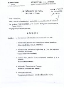 Le Président du Faso a procédé à un important remaniement gouvernemental sur proposition du Premier ministre, selon un décret rendu public ce jour. Cette nouvelle équipe gouvernementale traduit la volonté des autorités de renforcer l’efficacité de l’action publique, dans un contexte marqué par des défis sécuritaires, économiques et sociaux majeurs.