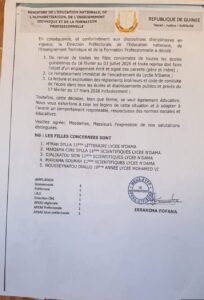 Dans le communiqué officiel, le Directeur préfectoral de l’Éducation, Ibrahima Fofana, insiste sur le caractère éducatif de cette décision, qui vise à rappeler aux élèves la nécessité d’adopter un comportement responsable, conforme aux normes sociales et aux exigences du système éducatif guinéen.