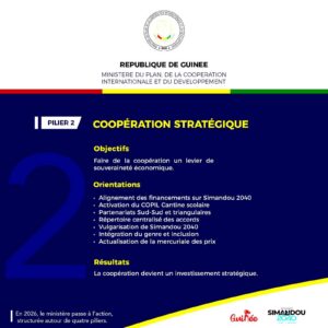 Deuxième pilier : la coopération internationale. Le département entend renforcer l’alignement des financements extérieurs et des partenariats techniques sur les priorités définies par l’État. Il s’agit de faire de la coopération un instrument au service de la souveraineté économique, en privilégiant la cohérence, la coordination et la lisibilité des interventions.