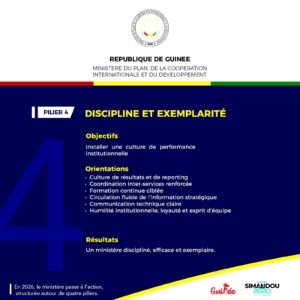 Enfin, le quatrième pilier porte sur la discipline interne et l’exemplarité. Le ministère annonce la mise en place d’une culture de performance fondée sur la rigueur, l’évaluation et l’atteinte d’objectifs concrets. L’enjeu est de consolider une administration structurée, orientée vers les résultats et capable de répondre aux exigences de transformation.
