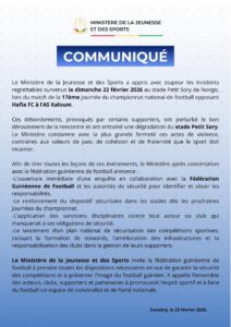 Dans ce document, le département indique avoir « appris avec stupeur les incidents regrettables survenus le dimanche 22 février 2026 au stade Petit Sory de Nongo, lors du match de la 17ème journée du championnat national de football opposant Hafia FC à l’AS Kaloum ».