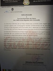 Signée par Djénaba Sory Camara, Administrateur général de Police, cette circulaire traduit la volonté des autorités de renforcer la discipline, la professionnalisation et le respect strict des missions dévolues à chaque corps au sein de la Police nationale.