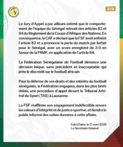 La Fédération Sénégalaise de Football (FSF) est montée au créneau après la décision choc rendue le 17 mars 2026 par le Jury d’Appel de la Confédération Africaine de Football (CAF), dans le cadre du litige opposant le Sénégal au Fédération Royale Marocaine de Football (FRMF) lors de la CAN 2025.